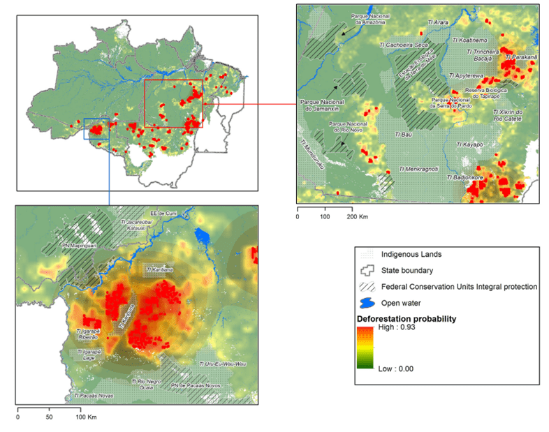 The threat of further deforestation is most severe in regions that have recently experienced high levels of forest loss, particularly in the eastern and southern parts of the Brazilian Amazon biome, including the states of Pará, Mato Grosso, and Rondônia. This risk is expected to rise along the borders of numerous indigenous territories, especially in the states of Pará and Rondônia.